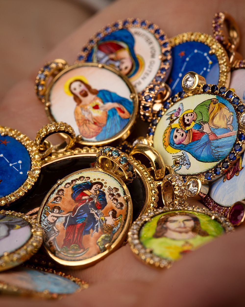 Die Schmuckstücke der Himmelskind Kollektion leben von ihrer Detailtiefe: winzige Emaille-Gemälde, die auf engstem Raum ganze Geschichten erzählen.